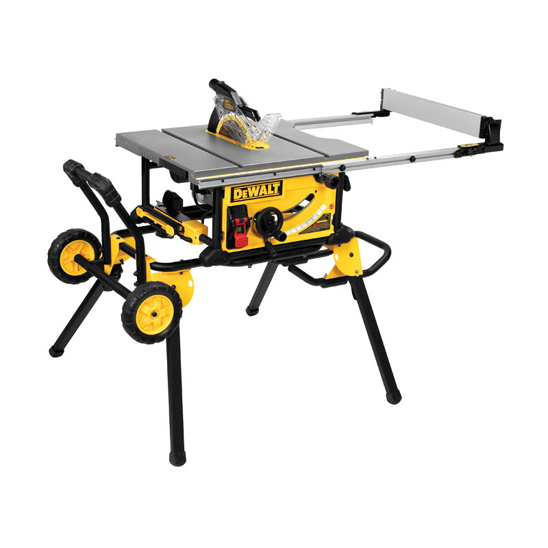 The DWE7491RS 10″ Jobsite Table Saw 32 – 1/2″ Rip Capacity, and a Rolling Stand has a 15 Amp motor and 32-1/2″ rip capacity to allow cutting of large and hardwood materials. Features tool-free guarding component adjustments and fast, accurate fence adjustments. Rolling stand designed for easy setup and breakdown with excellent stability.