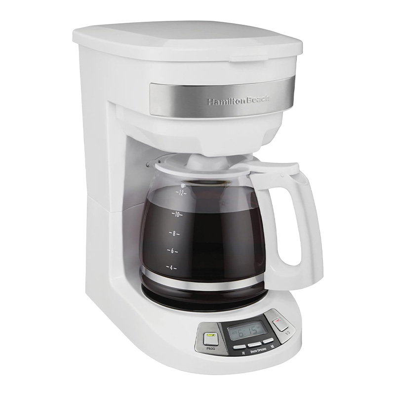 The Hamilton Beach Coffee Maker has a large 12-cup capacity and is programmable, so your coffee is hot and ready in the morning when you wake up. Choose from 3 brewing options: regular, bold or 1-4 cups. Includes auto shutoff. The drip coffee maker automatically turns off after 2 hours for peace of mind. Automatically pauses brewing when you lift the carafe to pour a cup of coffee.