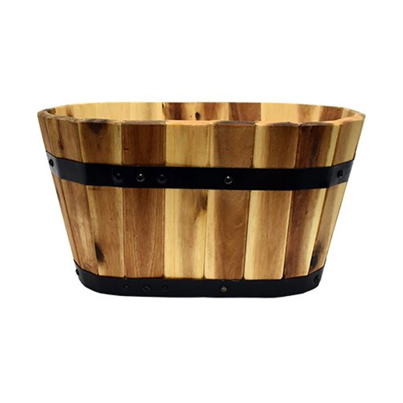 This beautiful, all-natural wooden planter is made using tongue and groove construction and secured with steel bands for long lasting durability. It is factory sealed with natural linseed oil and pre-drilled holes provide proper drainage.