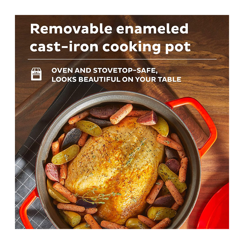 - The heavy-duty enameled cast-iron cooking pot is removable, oven and stovetop-safe