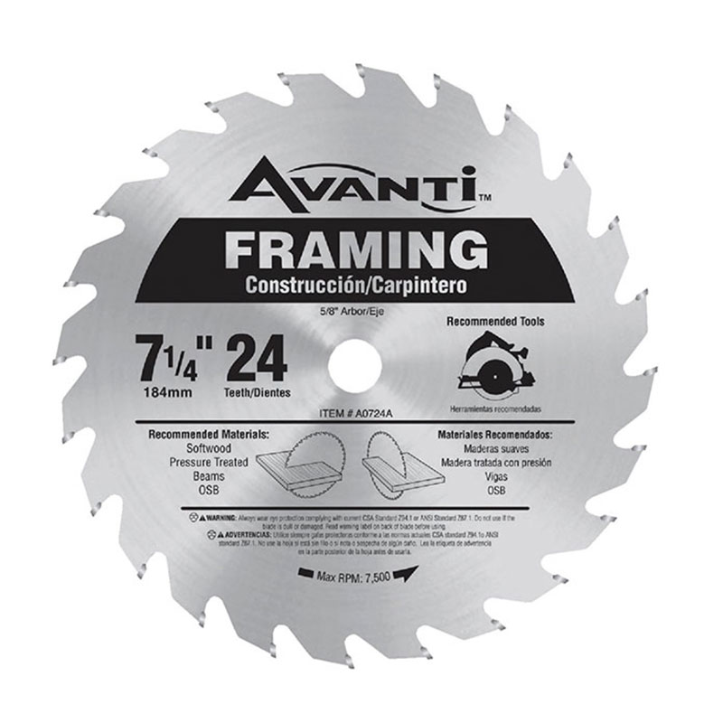 The Avanti 7-1/4 in. x 24-Tooth Framing Circular Saw Blade is an economical, high-performance blade that can be sharpened when needed to extend its service life. The high-quality steel is manufactured with carbide and lasts up to 30 times longer than regular steel blades. It is designed for DIY projects and construction use and is ideal for softwood, pressure-treated beams, and oriented-strand board (OSB).