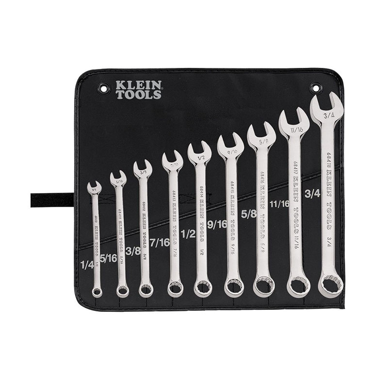 The Klein Tools 9 Piece Combination Wrench Set contains 9 standard-size wrenches ranging from 1/4 to 3/4 Inch. These high-quality hand tools are drop forged from steel alloy, hardened and tempered for strength and long-lasting use. Each wrench is lightweight. Both ends of wrench have 15 Degrees offset for use in confined spaces. Wrench has nickel chrome-plated alloy steel forged construction. Corrosion resistant. Nickel chrome plated.
