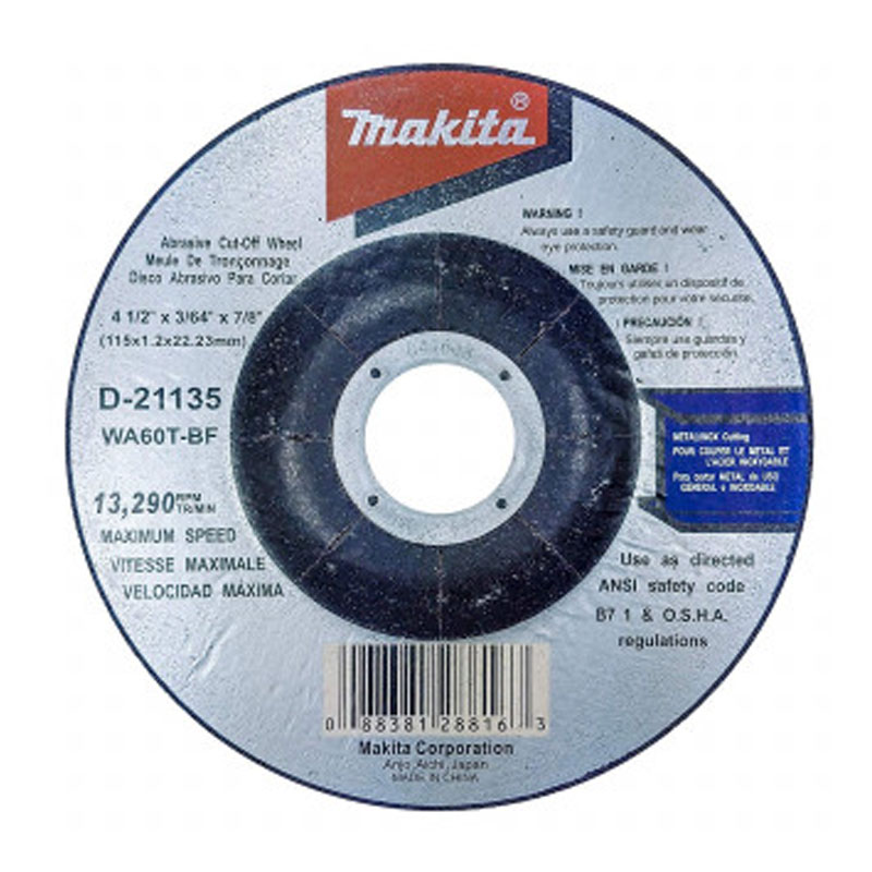 Makita D-21135, Disc Metal 4-1/2 Inch x 3/64 Inch x 5/8 Inch (SS) Depressed For making cuts in metal and stainless steel pipes, sheet, wheel thickness.