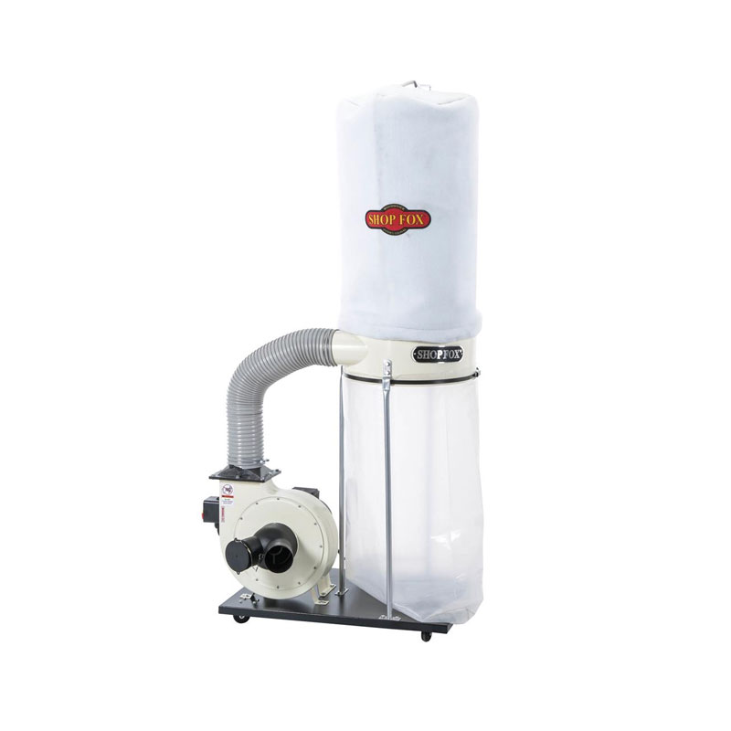 A powerful dust collector from Shop Fox! This unit features an extra heavy-duty 12″ steel impeller and a 1-1/2 HP motor that runs on 110V. For wood dust only. Models manufactured after June 2015 come with a 2.5 micron felt upper filtration and a plastic (PE) lower collection bag.