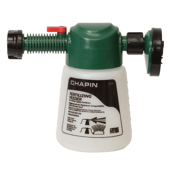 The Chapin G405 Fertilizing Feeder Hose-End Sprayer fits any standard hose end and has a built-in anti-siphon feature to prevent backflow and automatically mixes dry, water-soluble fertilizers.