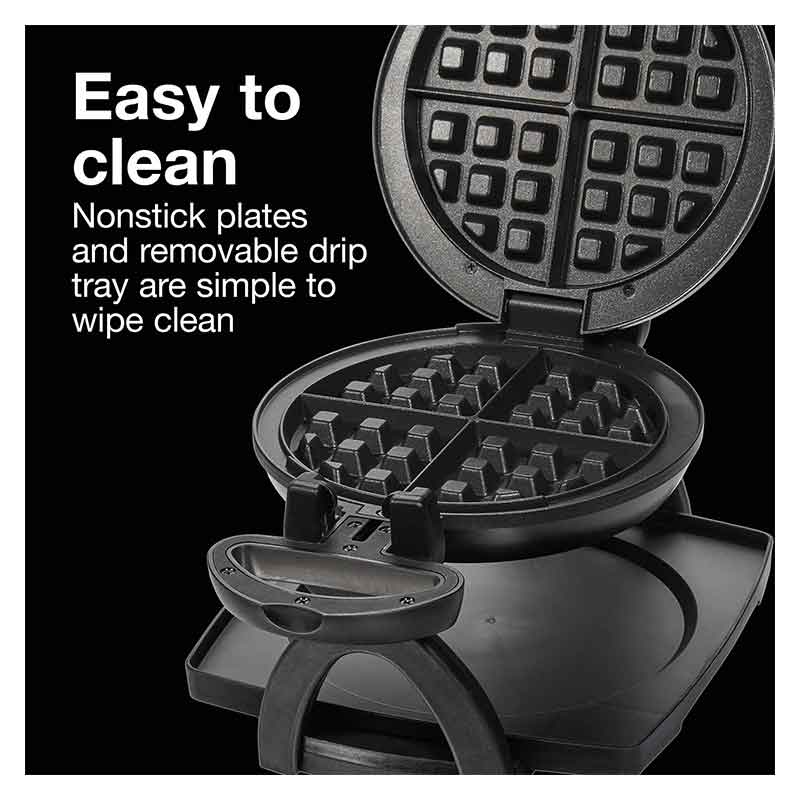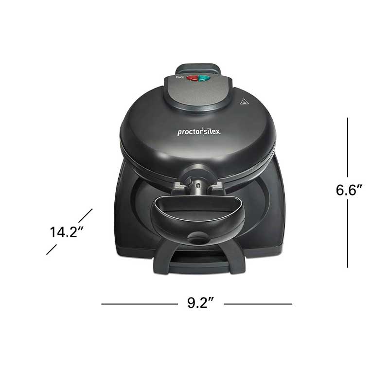 It’s easy to cook restaurant-quality Belgian waffles at home in minutes with the Proctor Silex Flip Belgian Waffle Maker. The flipping action ensures waffles are thick, fluffy and evenly golden-brown every time. With nonstick plates, it’s easy to remove your waffles from the waffle maker after they’re cooked because there’s no sticking. Flipping waffles is effortless with a cool-touch handle that’s easy to grip. The waffle maker is simple to use with power on and ready indicator lights, so there’s no guesswork. When the green ready indicator light illuminates, it’s time to add the waffle batter. The nonstick waffle maker plates are simple to wipe clean, and the removable drip tray catches splatters down below to reduce mess. Dimensions (inches): 14.2 D x 9.2 W X 6.6 H