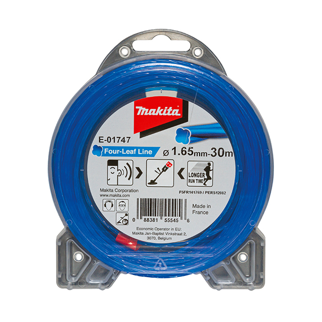 The Makita #E01747 Four Leaf Line 1.65mm is specially designed for cordless scalpers and trimmers, suitable for low and high grass. The shape, which is reminiscent of a clover leaf in the cross-section, forms a lower air resistance than with a round mower line.