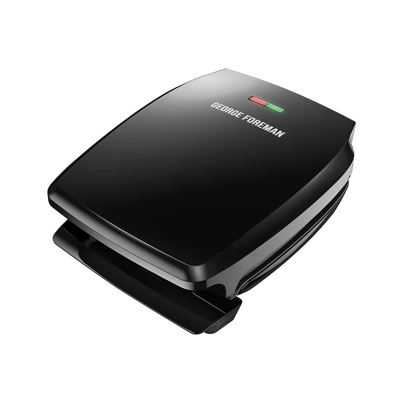 The George Foreman 4-Serving Classic Plate Grill and Panini deliver fast grilling and delicious results for steak, burgers, chicken, veggies, and more. The patented sloped surface helps remove fat during cooking, and the Advanced George Tough nonstick coating wipes clean after every use. This compact grill is perfect for small families, and its dual contact heating speeds up grilling to get food on the table in record time.