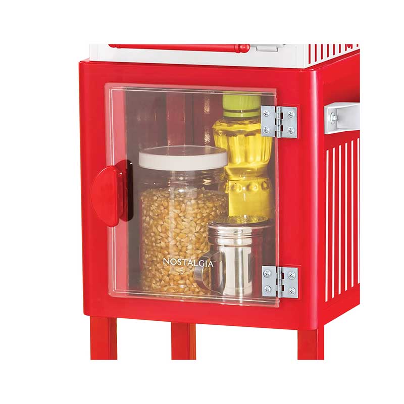 - Conveniently store your popcorn kernels, oils, seasonings, candy, or other serving accessories in the see-through storage compartment located in the base of the unit