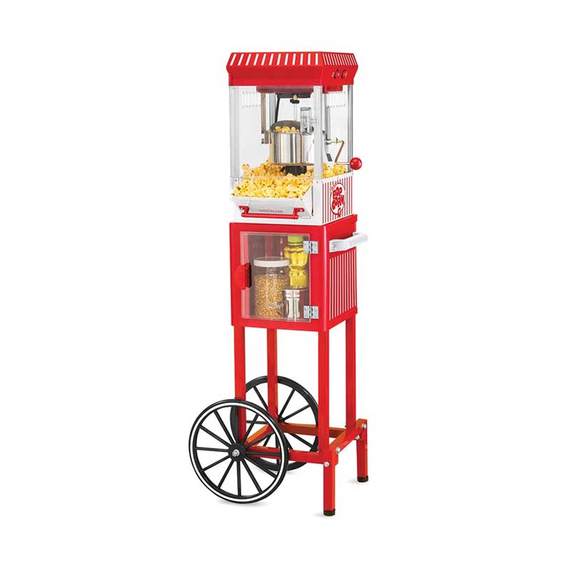 With its unique vintage style and ease of use, this Nostalgia #KPM200CART Popcorn Cart 45″ will be the hit of every party! Featuring a large 2.5-ounce stainless steel kettle with a built-in stirring system that can pop up to 10 cups of popcorn per batch. The vented windows and lighted interior allow you to watch the popcorn popping so you know right when to empty the kettle and the tilt door allows for easy serving access. It includes an oil measuring spoon and kernel measuring cup to ensure a perfectly popped popcorn every time. Popcorn has never tasted so good at home.