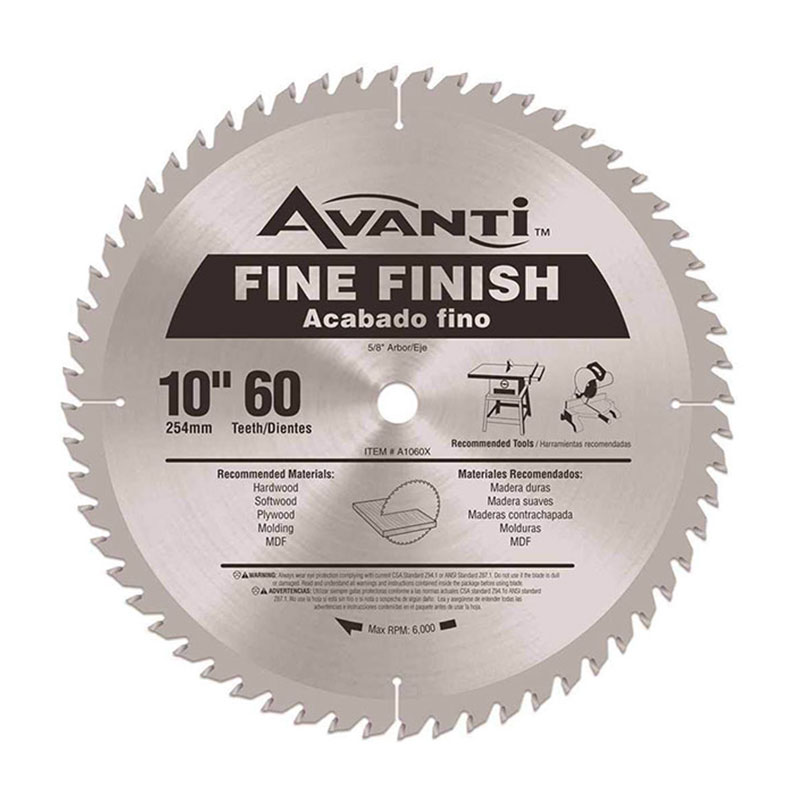 Rejuvenate the wood-cutting ability of your table saw or miter saw with the 10 in. Fine Finish saw blade from Avanti. Constructed with carbide-reinforced steel, this blade consists of 60 sharp teeth to cleanly slice through MDF, hardwood, softwood, plywood, and molding. Four expansion slots help the blade expand and contract during use, resulting in minimal vibration and straight cuts.