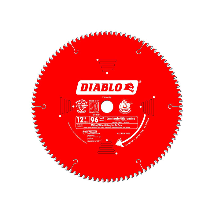Freud Diablo D1296L, Melamine, Laminate Flooring, and Wood Saw Blade 12 Inch Arbor For use with miter saws, Shear-face grind design delivers effortless cuts with a reduced amp draw on tools for less material waste.