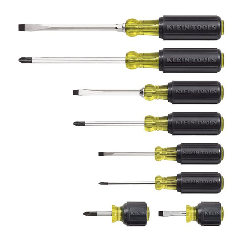 The Klein Tools 8-Piece Cushion-Grip Screwdriver Set is an ideal collection for any handyman or electrician. These screwdrivers are made from durable tempered steel and feature cushion-grip handles for added torque and slippage resistance. Each handle end is color coded for quick and easy identification. The premium chrome-plated shanks provide a smooth feel and resist corrosion.Includes 8 Cushion Grip Screwdrivers, 1/4 Inch (6.4 mm) , 5/16 Inch (7.9 mm) Keystone, 5/16 Inch (7.9 mm) and 3/16 Inch (4.8 mm) Cabinet Tip, #1 Phillips, #2 Phillips Stubby, #2 Phillips, #3 Phillips.The Internal flanges inside handle provide solid, twist-resistant blade anchor. Made of Special heat-treated shafts. Precision-machined tip for exact fit. It Meets or exceeds applicable ASME / ANSI specifications.