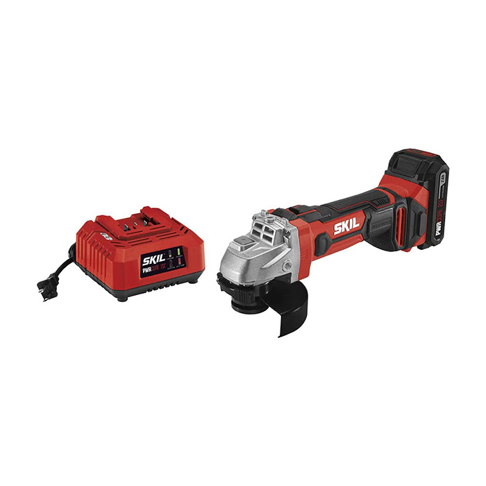 Skil Cordless Angle Grinder. The AG290202, 20V 4-1/2 Inch Skil Cordless Angle Grinder comes with a 2.0Ah PWRCore 20 Lithium Battery and charger for a variety of DIY tasks including cutting tile, grinding metal, sanding, polishing, sharpening, and more.