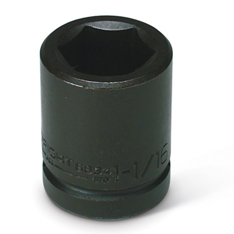 This socket attaches to a socket wrench, ratchet, torque wrench or other turning tool in order to tighten or loosen a fastener such as a nut or bolt by turning it.Wright 6-Point sockets use the patented Wright Drive design for greater strength and longer life. Wright impact tools are stronger and tougher to withstand the repeated high loads produced by impact guns. Wright impact sockets are always black, not only to distinguish them from hand sockets, which are usually plated, but also to avoid the chipping which could occur when a plated socket is subjected to thoughts of cycles of very high loads.Each Wright impact socket is designed for its drive size because the drive size limits the torque that may be applied. It has a black oxide finish.
