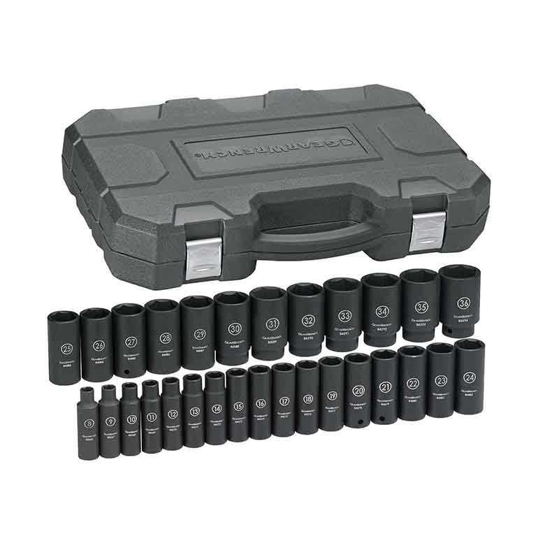 Gear Wrench 84935N, 29 Pieces 1/2 Inch Drive 6 Pt. Impact Socket Set, Deep, Metric. Impact Socket Set, Deep, Metric with chamfered openings and an attachment port compatible with traditional ratchets. Made from chrome molybdenum alloy steel (CR-MO) for exceptional strength and durability. Off-corner loading technology to reduce fastener rounding, even after repeated use.