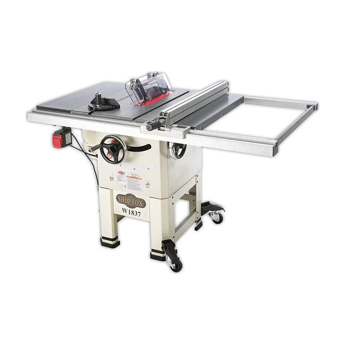Shop Fox W1837, Open-Stand Hybrid Table Saw 10 Inch 2 hp is an easy to transport weight and size of a high-end contractor saw, but with dust control and the full features of a cabinet saw.