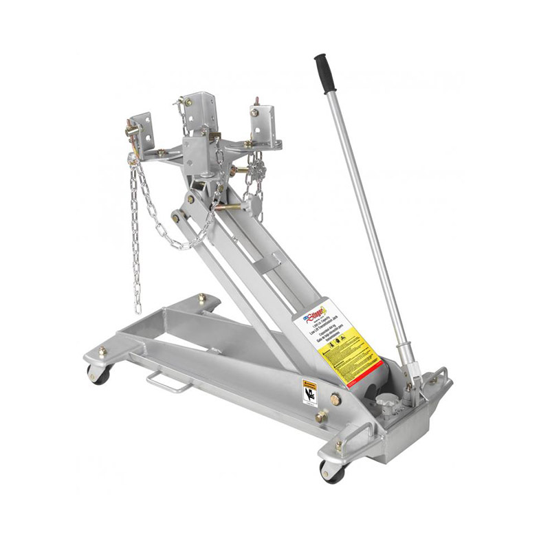OTC 1521A, 1,000 LB Capacity Low-Lift Transmission Jack. Universal mounting head, with adjustable brackets, tilts front to back and side to side. Height range: 6-1/2 Inch to 29-1/2 Inch. Safety chains hold the load securely, even while moving about the shop. Wide wheel base with four swivel casters, and two handle grips makes it easy to position under the vehicle. Safety overload prevents use beyond its rated capacity. Pump handle rotates a full 360 degrees for use in any position. Flash-chromed ram inhibits rust from entering the hydraulic system